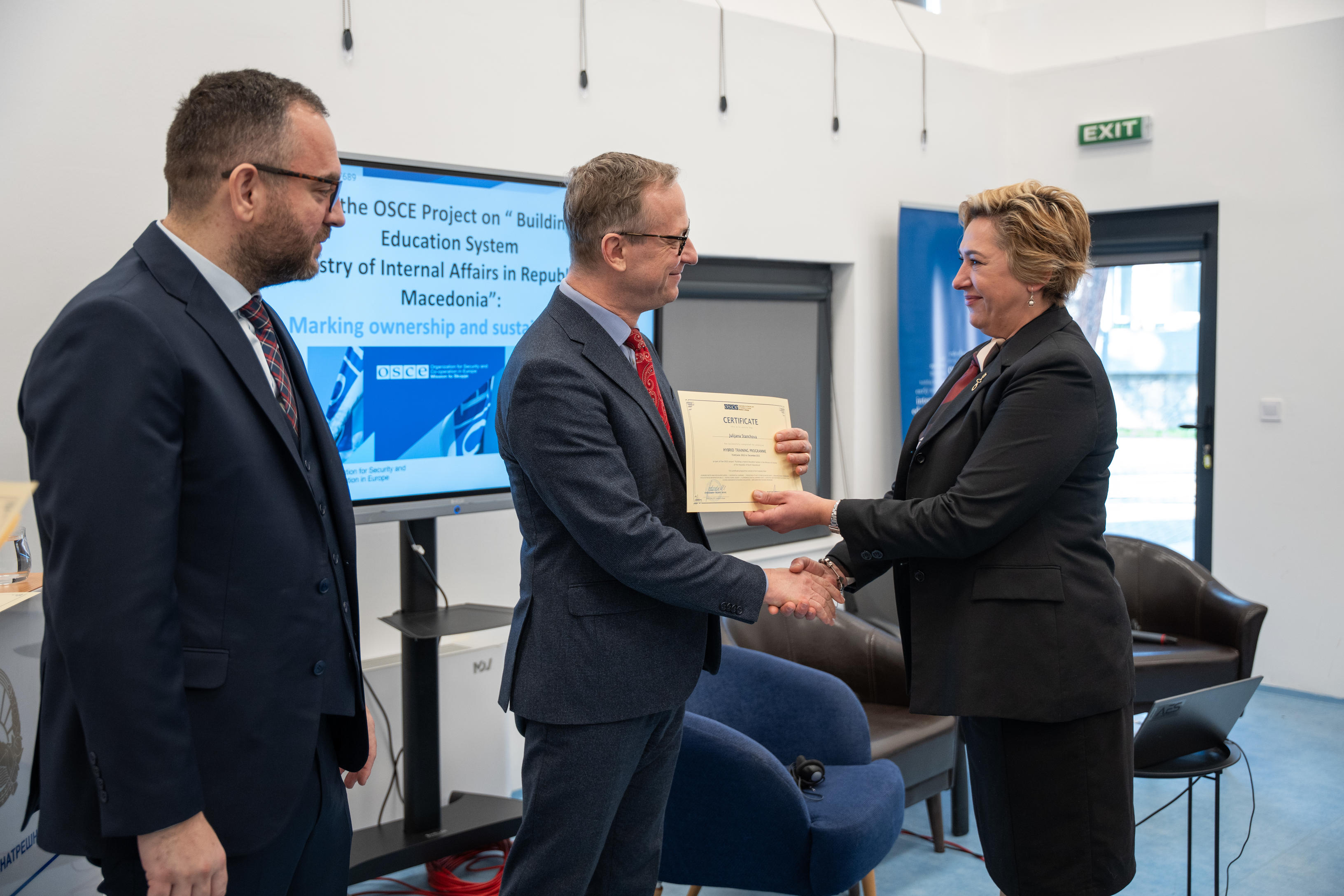 The Head of the OSCE Mission to Skopje (c) shakes hands with a police officer (r) while presenting her with a certificate during an indoor official event. The Minister of Interior (l) stands nearby observing the exchange, and a screen in the background displays an OSCE project presentation related to the education system.