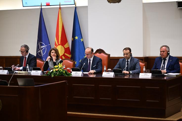 Five officials seated at a conference table during a parliamentary event, with NATO, North Macedonia, and EU flags behind them. From right to left: Ambassador Kilian Wahl, Head of the OSCE Mission to Skopje; Ms. Sanja Lukarevska, Chairperson of the Finances and Budget Committee; Mr. Afrim Gashi, President of the Assembly; Mr. Bojan Stojanoski, Chairperson of the Economic Affairs, Labour and Energy Policy Committee; Mr. Maksim Acevski, State Auditor General.