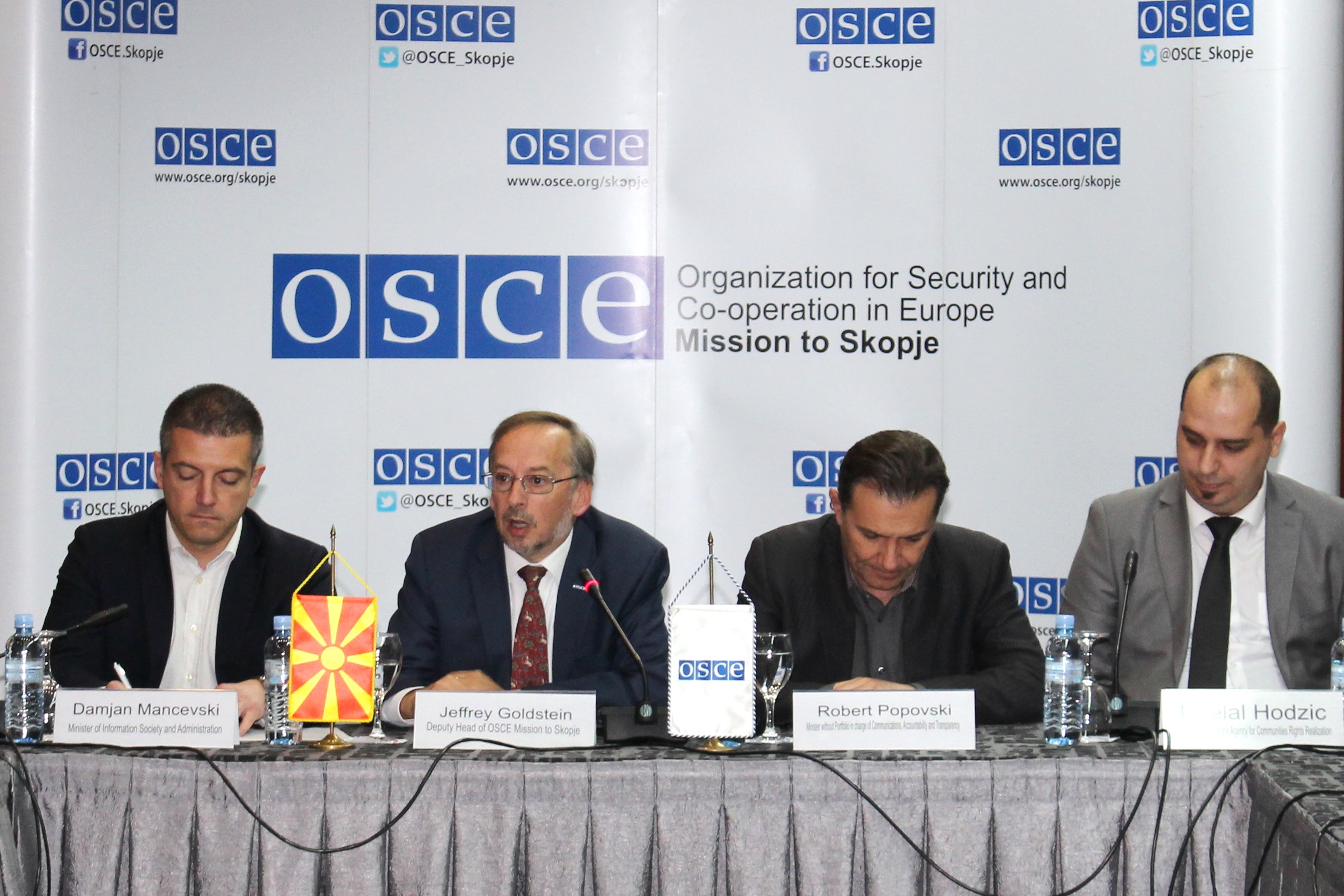 (l-r) Damjan Mancevski, Minister of Information Society and Administration, Jeffrey Goldstein, Deputy Head of Mission to Skopje, Robert Popovski, Minister without Portfolio in charge of Communications, Accountability and Transparency and Dzelal Hodzic, Deputy Director of the Agency for Communities Rights Realization during a roundtable , Skopje, 27 November 2017.