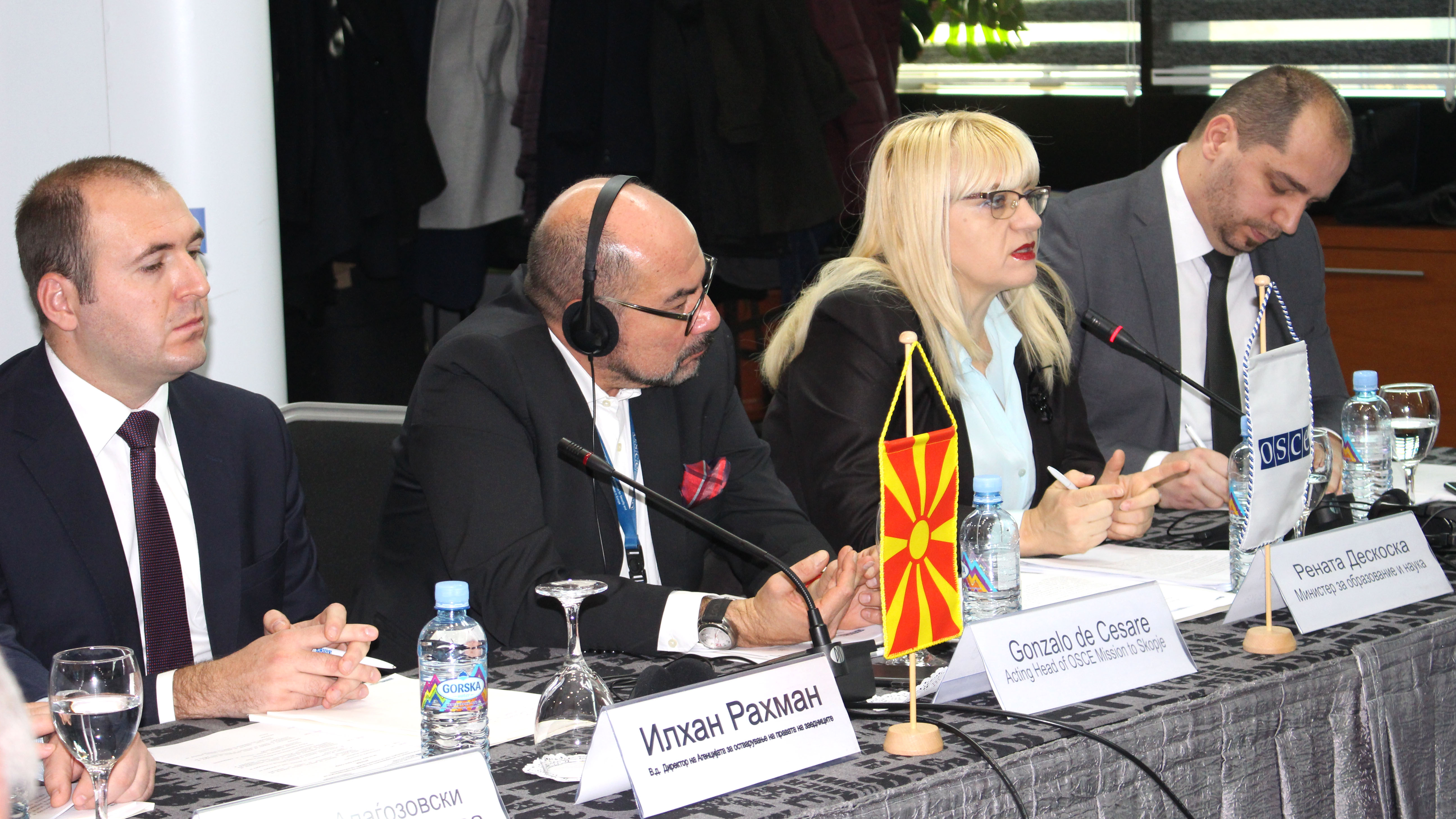 Head of Human Dimension Department of the OSCE Mission to Skopje, Gonzalo de Cesare (3rd from right) addresses the OSCE-supported roundtable discussion aimed to further advance the rights of smaller communities, Skopje, 6 December 2017.
