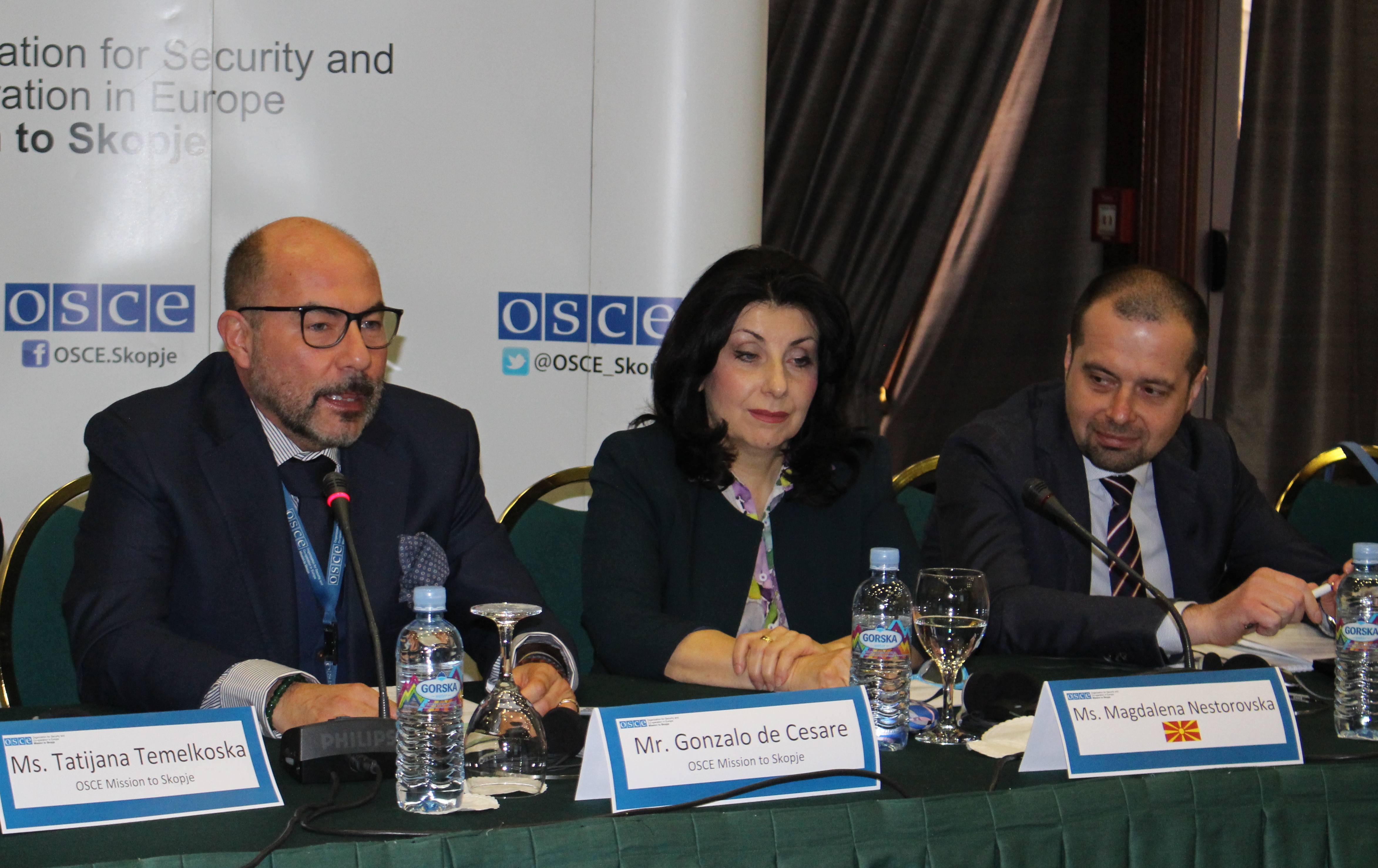Oleksandr Kyrylenko (r-l), Programme Officer at the OSCE Office of the Special Representative and Co-ordinator for Combating Trafficking in Human beings, Magdalena Nestorovska, National Anti-trafficking Co-ordinator and Interior Ministry State Secretary and Gonzalo de Cesare, Head of the Human Dimension Department at the OSCE Mission to Skopje, speaking at an OSCE-hosted workshop on countering trafficking in migrants, Skopje, 28 March 2018.