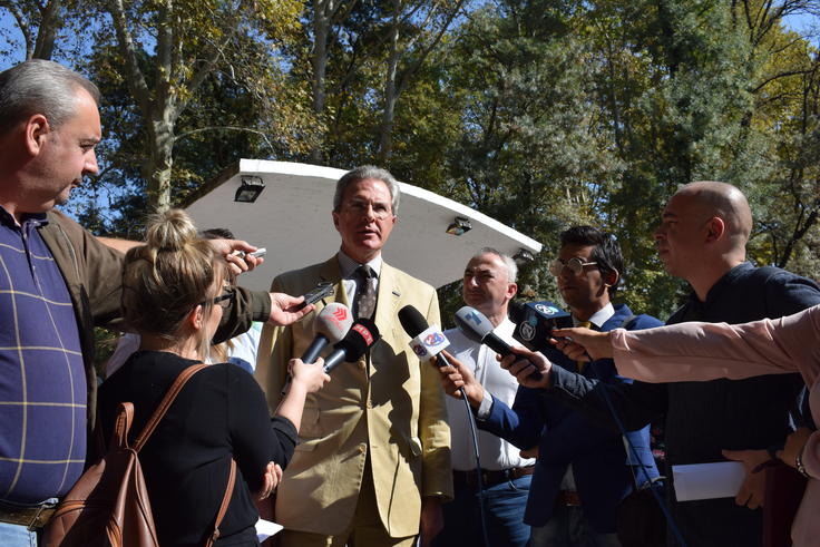 Head of OSCE Mission to Skopje Clemens Koja delivers a press statement before the opening of Building Bridges annual event. Skopje, 13 October 2018.