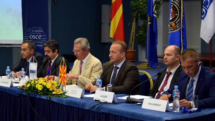 Ambassador Clemens Koja (centre-left), Head of the OSCE Mission to Skopje, addressing the participants of the OSCE international conference ‘Profiling and identification of returning foreign fighters’, Ohrid, 16 October 2018.