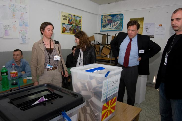 Ambassador Jose-Luis Herrero (right), Head of the OSCE Spillover Monitor Mission to Skopje, visits a polling station in Gostivar during the second round of the presidential and municipal elections on 5 April 2009.