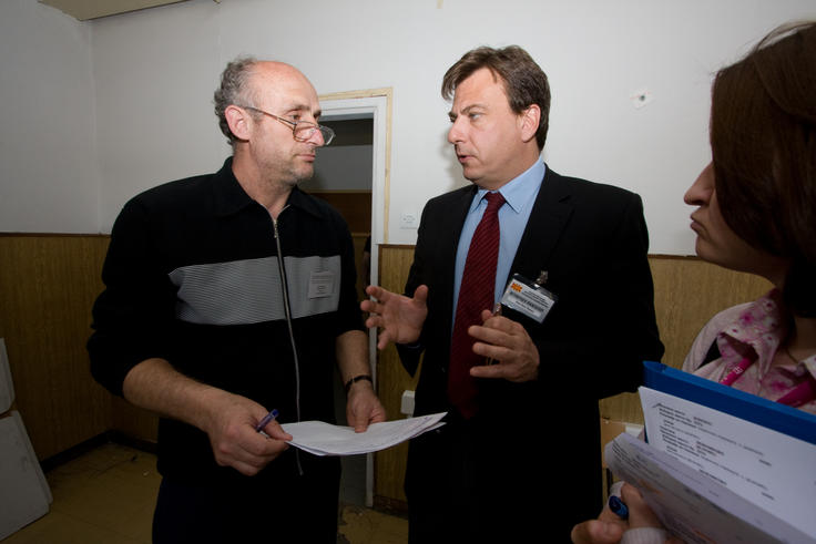 Ambassador Jose-Luis Herrero, Head of the OSCE Spillover Monitor Mission to Skopje talks to the president of the polling board at a polling station in Petrovec during the second round of the presidential and municipal elections on 5 April 2009.