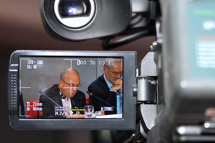 Ralf Breth, the Head of OSCE Mission to Skopje, pictured on a video viewfinder during a conference on good practices for political party and campaign financing, Skopje, 30 October 2013.