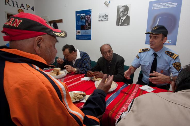 A police officer talks with representatives of the Roma community about their concerns, as part of an OSCE Mission to Skopje-supported project to improve co-operation between the police and Roma population, Skopje, 7 September 2009.