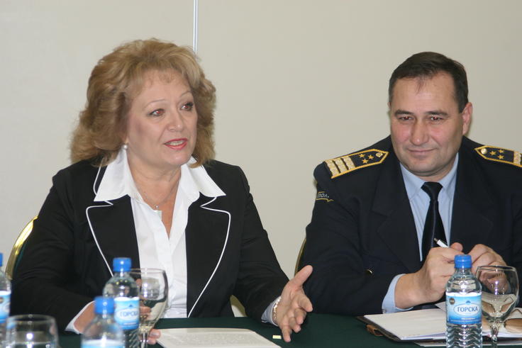 Ambassador Natalya Drozd (l), Deputy Head of the OSCE Spillover Monitor Mission to Skopje with Slave Vitanov, Head of the Prevention Unit at the Ministry of Internal Affairs, addressing participants at a gender course for police, Skopje, 18 November 2009.