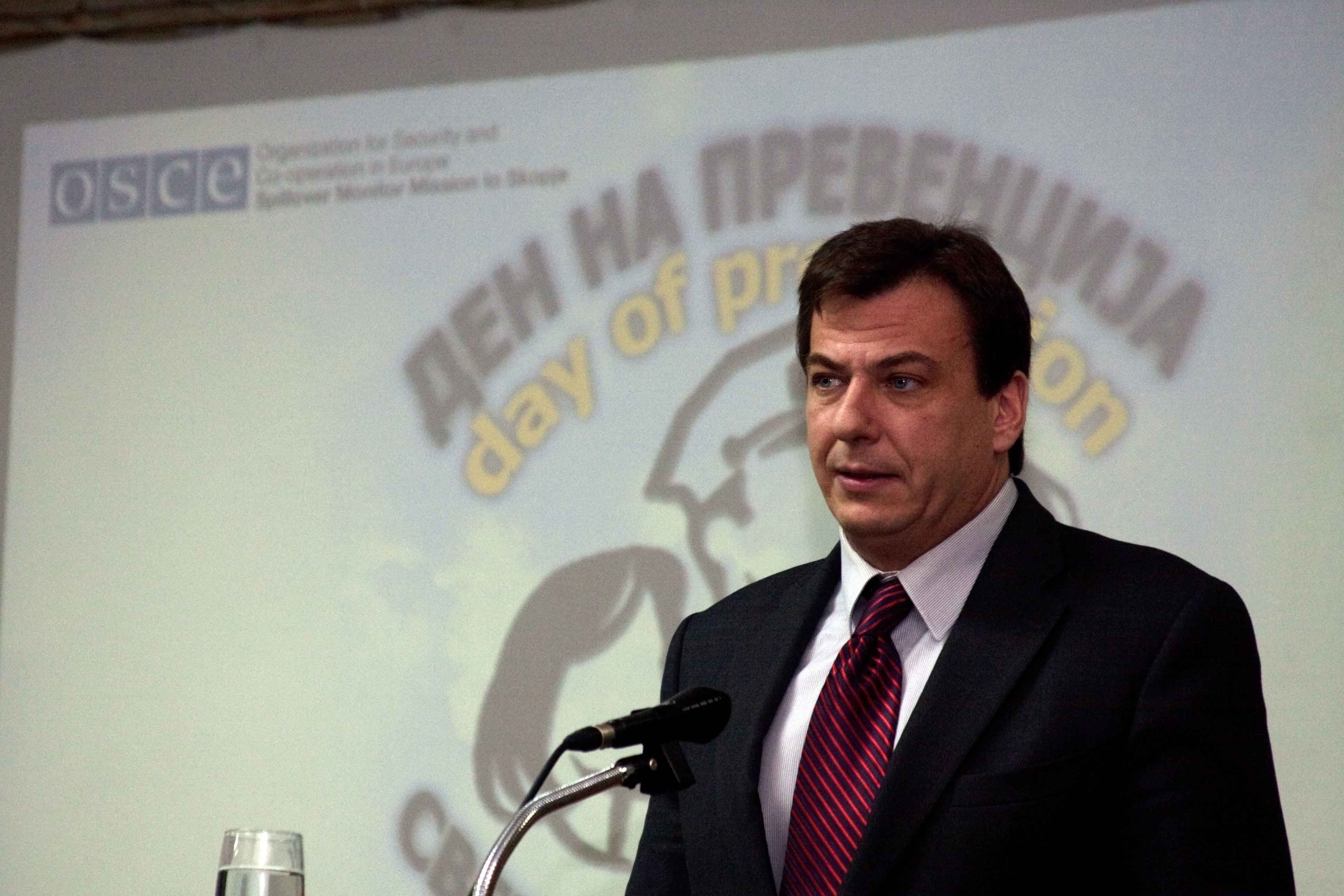 Jose Luis Herrero, Head of the OSCE Mission to Skopje, speaking at a graduation ceremony for police officers and inspectors who completed an OSCE-supported training course on community policing, Skopje, 9 December 2009.