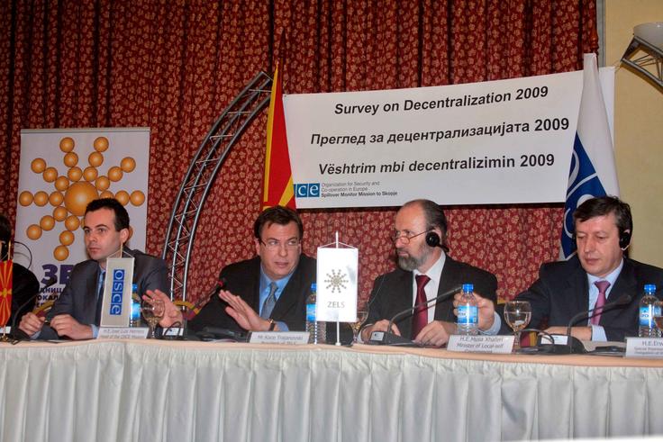 L-r: Deputy Prime Minister for European Affairs Vasko Naumovski, Head of OSCE Mission to Skopje Jose-Luis Herrero, President of the Association of Municipalities Koce Trajanovski, and Minister for Local Government Musa Xhaferi, Skopje, 17 December 2009.
