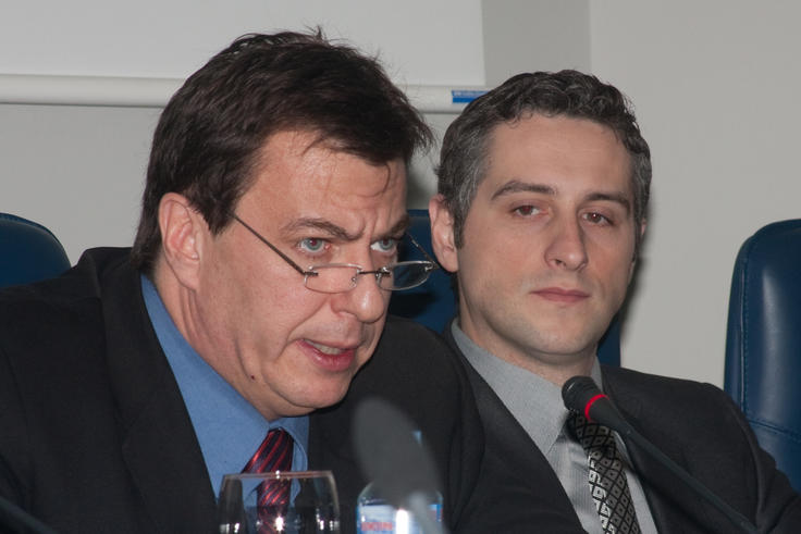 The Head of OSCE Spillover Monitor Mission to Skopje, Ambassador Jose Luis Herrero (l), and Education Minister Nikola Todorov at the presentation of an OSCE study on the impact of the education system on interethnic relations, Skopje, 4 February 2010.
