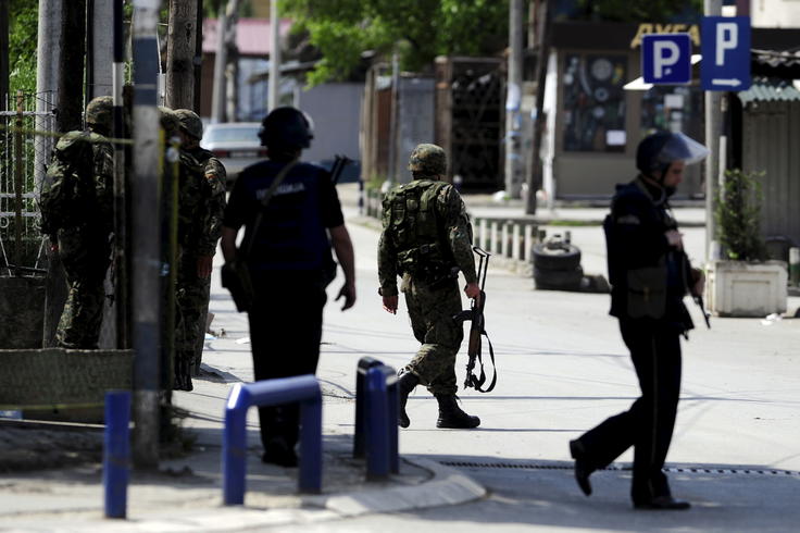 Police takes position near a checkpoint in Kumanovo, an ethnic Albanian suburb. Sporadic gunfire could be heard on Sunday, 10 May, after a day-long gun battle between police and an 'armed group', 10 May 2015.