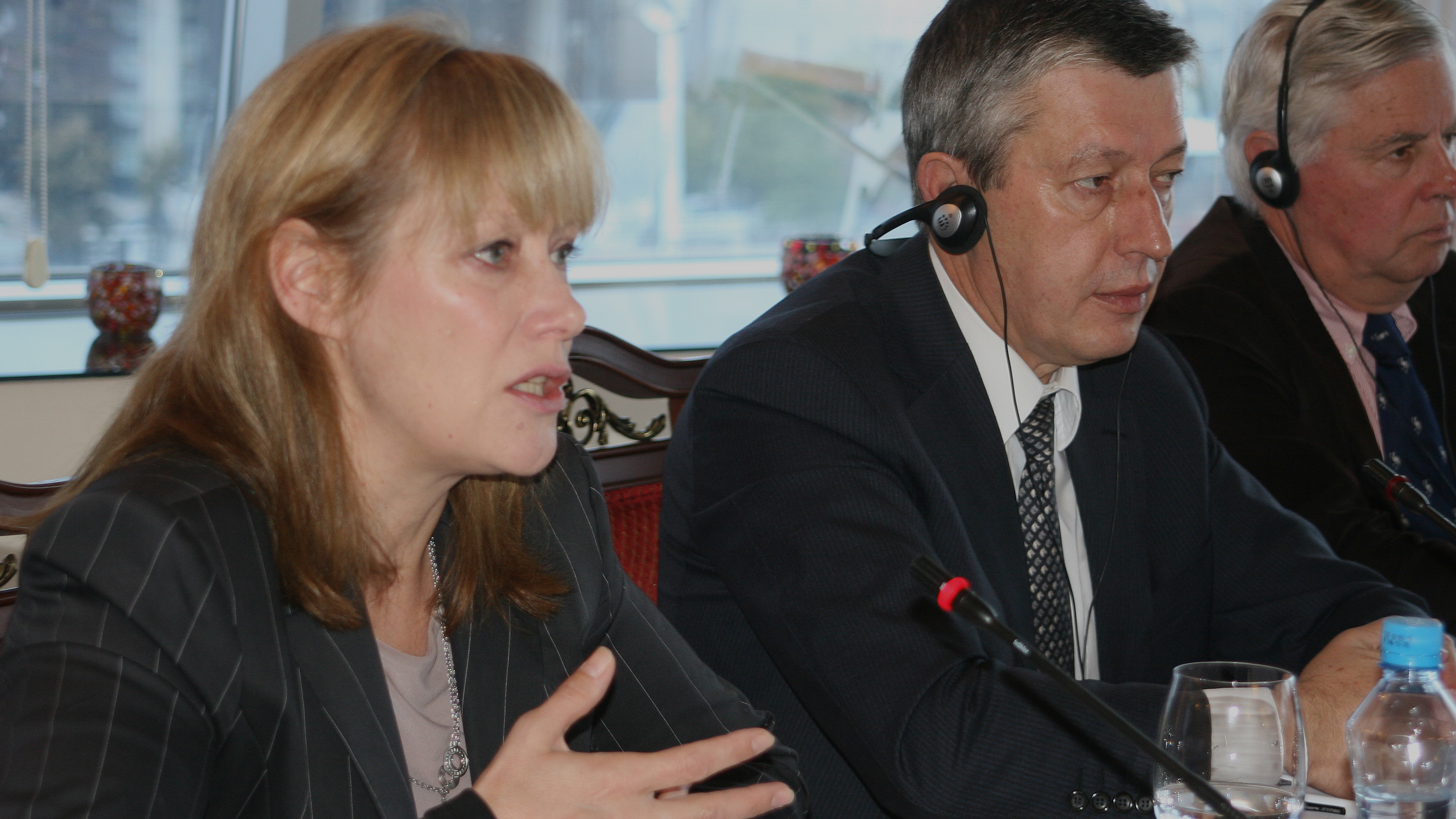 The Head of OSCE Mission to Skopje, Ambassador Nina Suomalainen, addresses the discussions on OFA review process along with Deputy PM Musa Xhaferri and representative of European Institute of Peace Pieter Feith. Skopje, 29 September 2015.