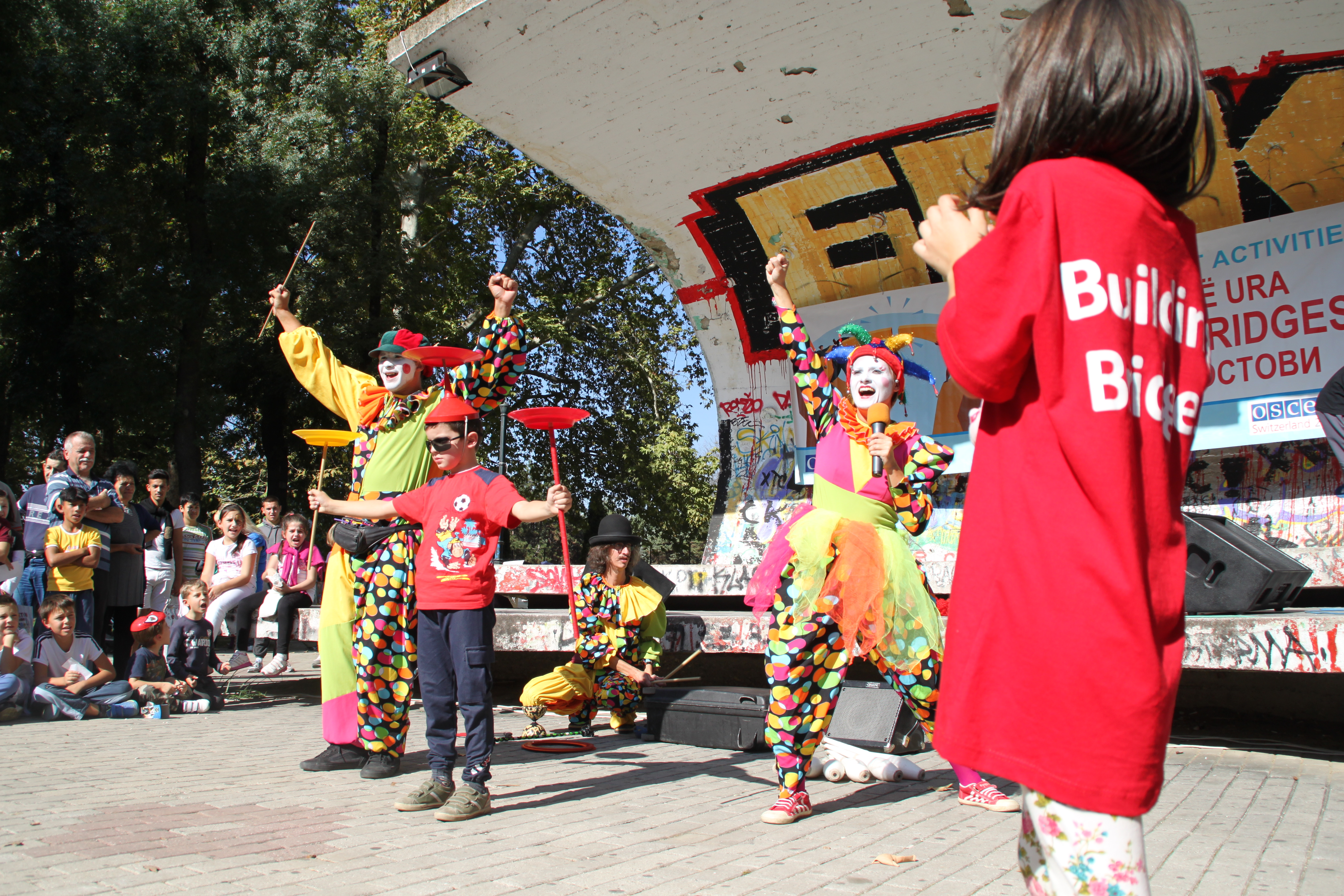 Students watch a performance as part of a OSCE-supported Building Bridges promotional event, Skopje, 3 October 2015.