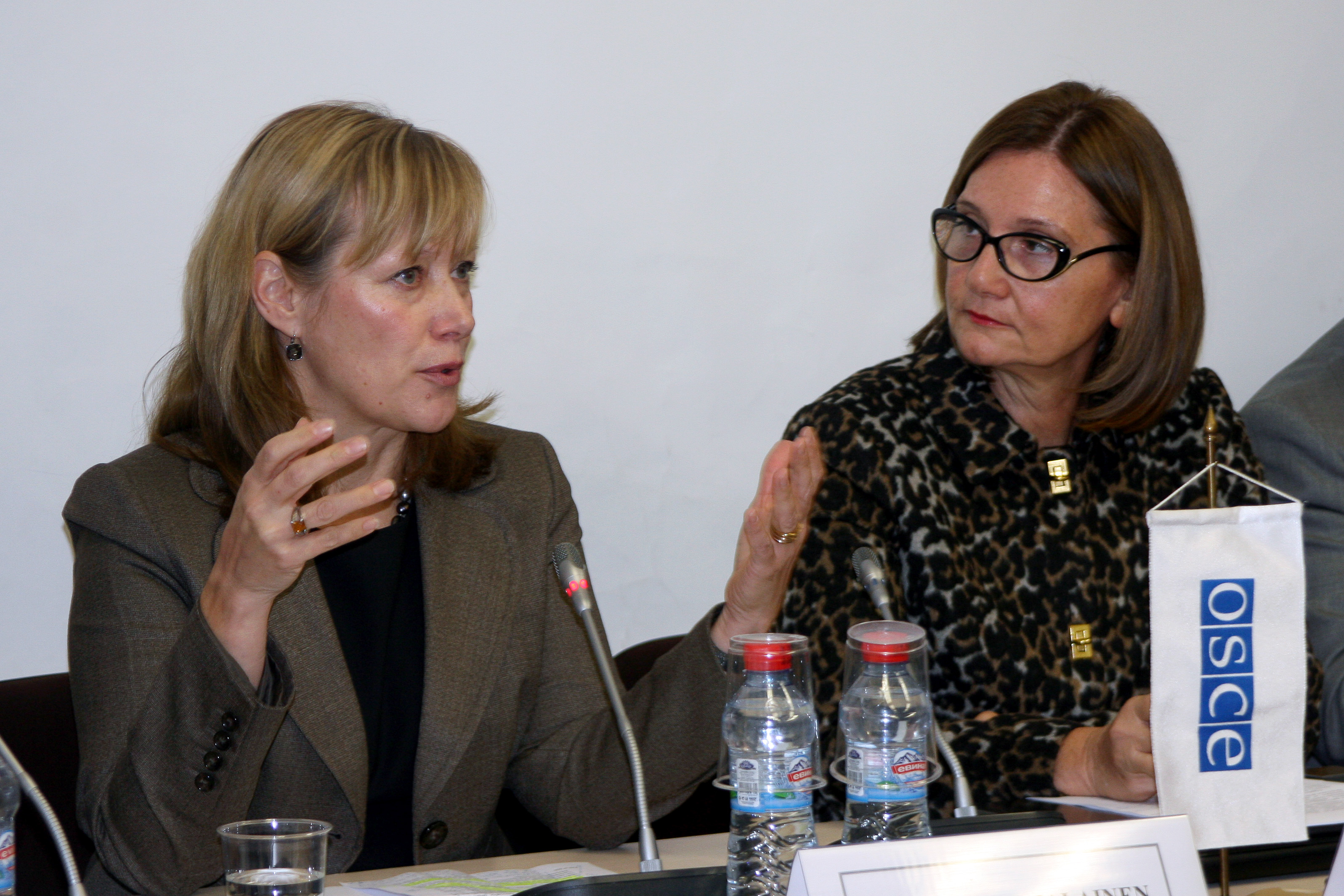 Head of OSCE Mission to Skopje Nina Suomalainen (l) and Director of the Academy for Judges and Public Prosecutors Aneta Arnaudovska (r) address the promotion of the two publications in Skopje, 28 October 2015.