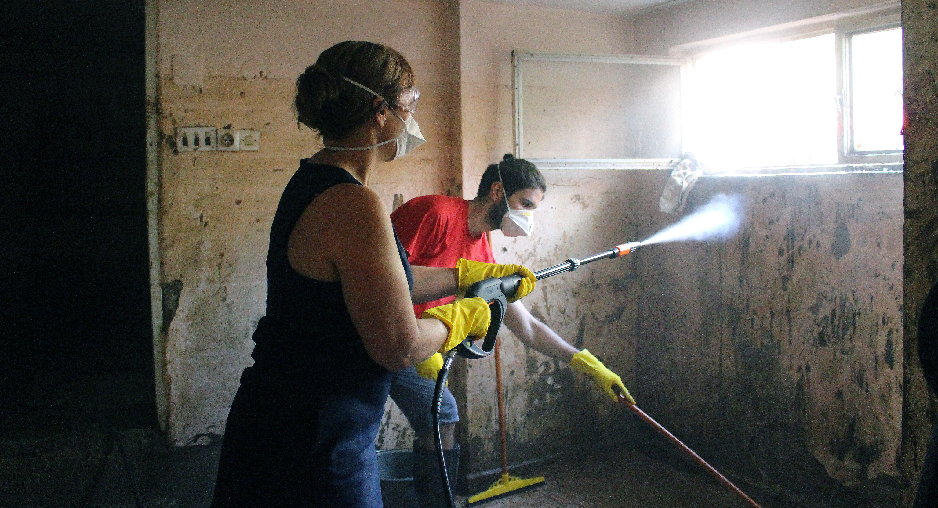 Head of OSCE Mission to Skopje, Ambassador Nina Suomalainen assists in cleaning mud and debris in flood affected areas. Skopje, 22 August 2016.