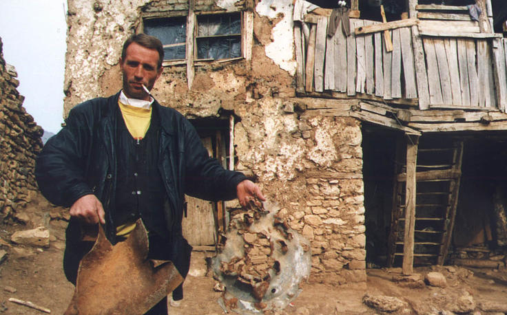A villager from Gorno Mojanci shows fragments of a mortar that