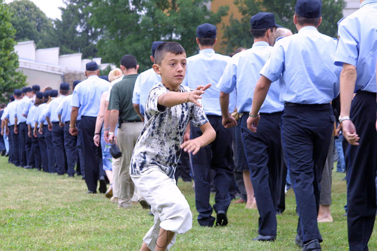 Newly trained police officers of different ethnic backgrounds brought along their families on graduation day in Idrizovo, 29 July 2002.
