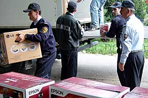 To maximize the impact of community policing, the OSCE Spillover Monitor Mission to Skopje delivers computers, printers and software to police in Tetovo, 14 October 2003.