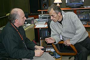Shpend Ahmeti (right) of the OSCE Mission's Media Development Unit speaks with Kokan Dimushevski of Radio Skopje during a training course on radio producing, November 2005.