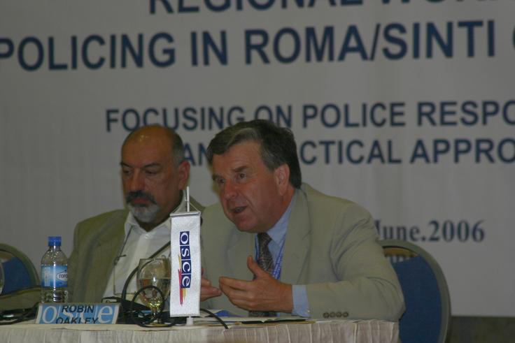Nicolae Gheorghe (l), Head of the ODIHR's Contact Point for Roma and Sinti Issues, listens as consultant Robin Oakley addresses a meeting on Roma/Sinti communities and the police hosted by the OSCE Spillover Monitor Mission to Skopje, 13 June 2006.