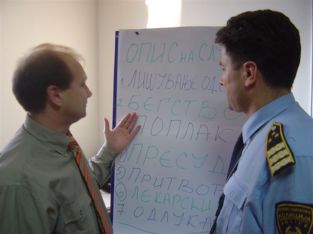 Yurii Derevianchenko (left), Police Instructor at the OSCE Mission to Skopje, during a training course held at the Police Academy from 6-22 February 2007 for officers on respect for human rights and the police Code of Ethics.