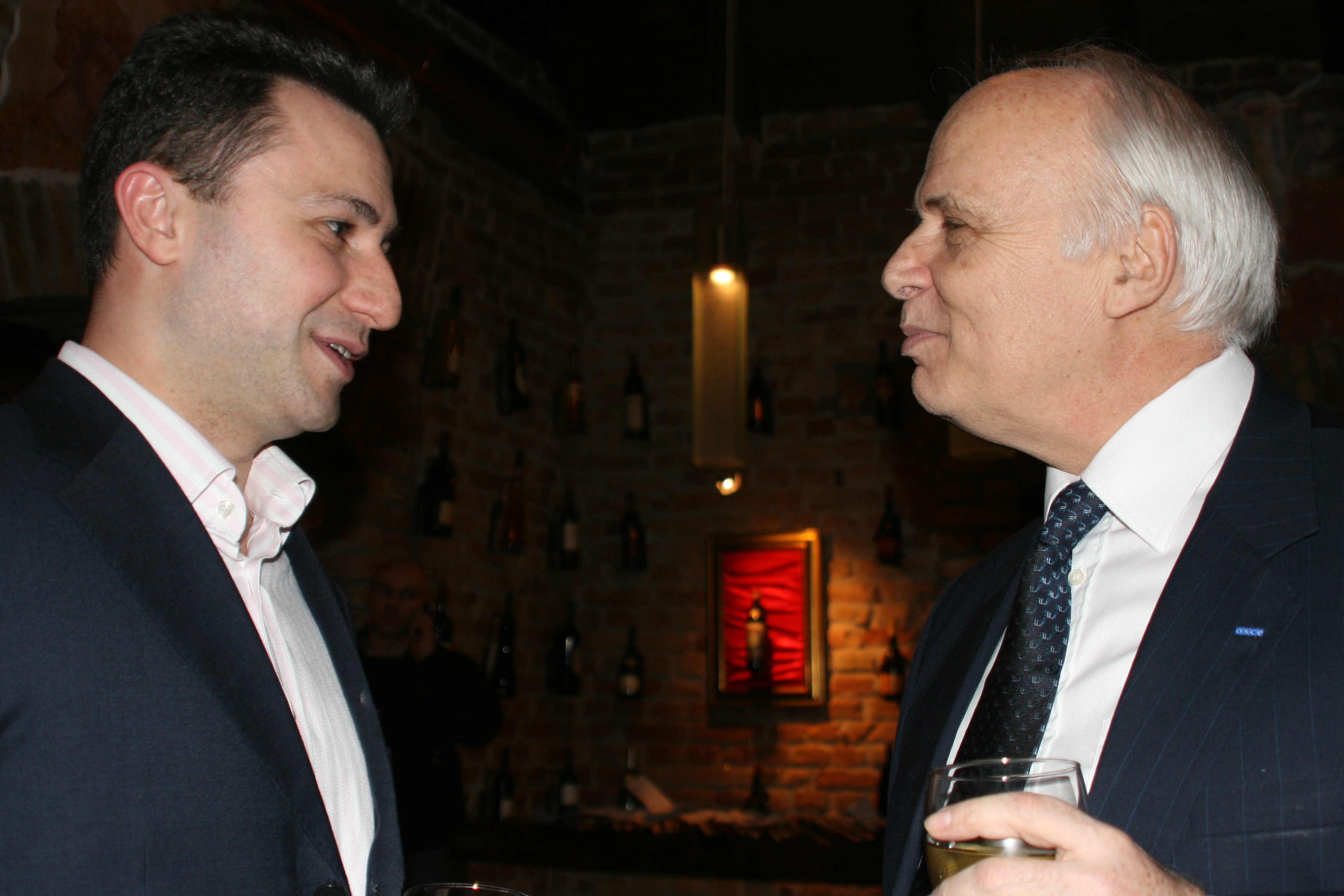 Ambassador Giorgio Radicati (right), Head of the OSCE Spillover Monitor Mission to Skopje, talks to Prime Minister Nikola Gruevski, Skopje, 28 February 2007.