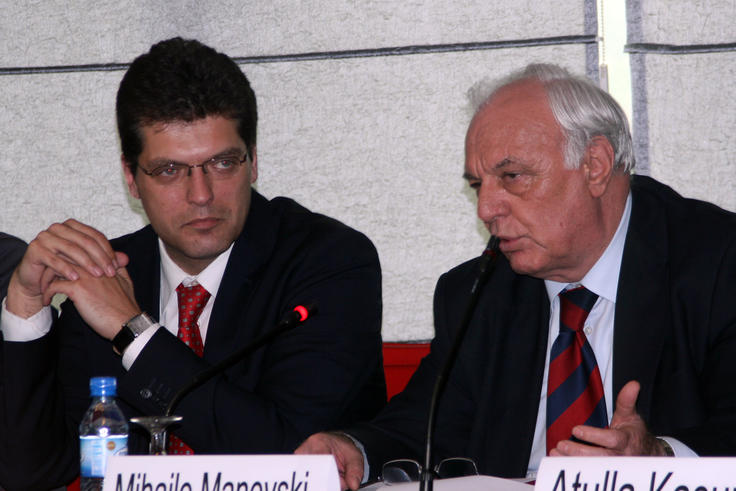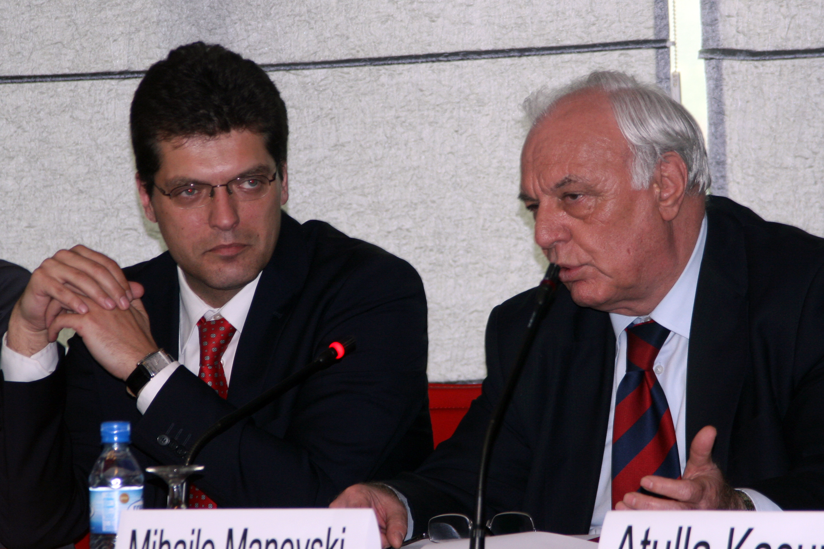 ODIHR Director Ambassador Janez Lenarcic (l) and Justice Minister Mihajlo Manevski at a presentation of recommendations for improvement of law-making process, Skopje, 4 May 2010.