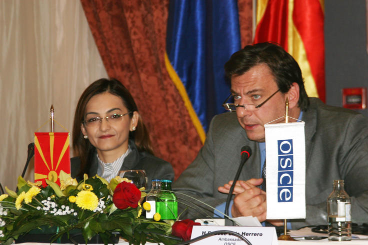Head of the OSCE Spillover Monitor Mission to Skopje Jose Luis Herrero (r), with Interior Minister Gordana Jankuloska, at the presentation of a survey on community policing, Skopje, 9 December 2010.