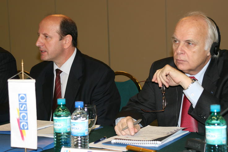 Ambassador Giorgio Radicati (right), Head of the OSCE Mission to Skopje, listens as the country's Ombudsman, Ixhet Memeti, addresses a meeting in Skopje on sharing best practices with the Ombudsman of Aragon (Spain), 13 November 2007.