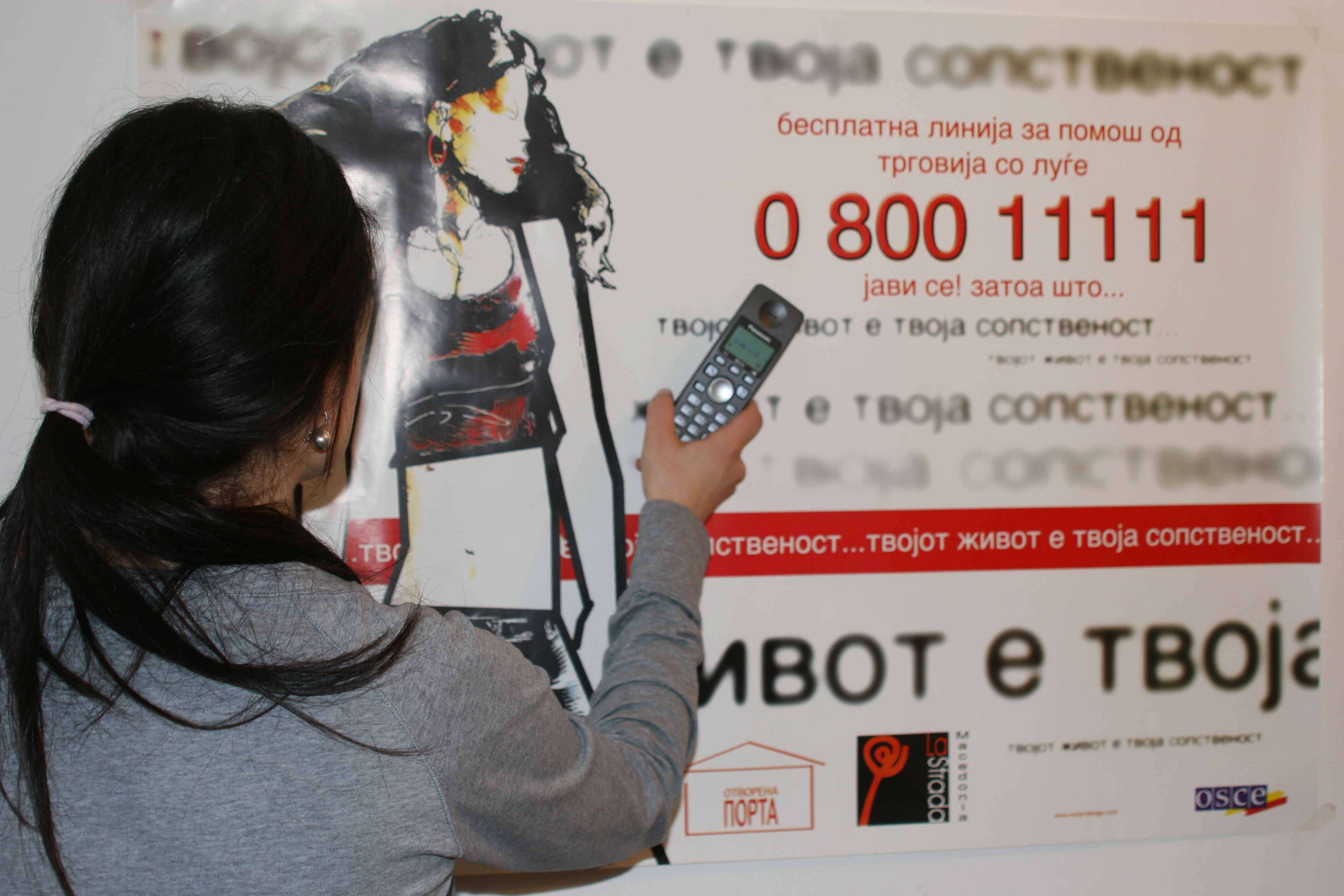 An operator of a 24-hour SOS help line for trafficking victims stands in front of a poster advertising the service, 15 March 2007. The help line was set up by the local NGO La Strada/Open Gate in 2002 with support from the OSCE Mission to Skopje.