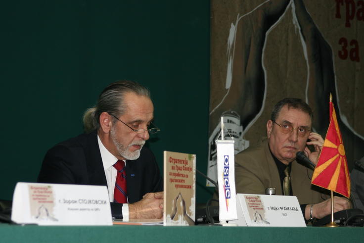 Michael Frankland (l), the Head of the OSCE Mission to Skopje's Public Administration Reform Unit, and Blagoja Corevski, Chairman of Skopje city council, at the launch of Skopje's strategy for co-operation with NGOs, 12 December 2007.