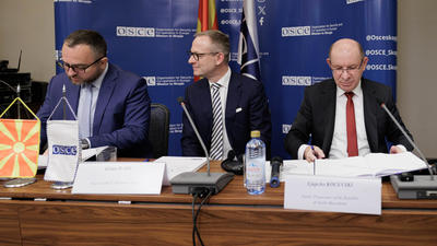Shkup, 10 prill 2025 – Sot, Ministria e Punëve të Brendshme dhe Prokuroria Publike e Maqedonisë së Veriut firmosën Protokollin e ri të bashkëpunimit, duke riafirmuar përkushtimin e tyre për forcimin e koordinimit ndërinstitucional dhe efikasitetit të hetimeve penale. Misioni i OSBE-së në Shkup ndihmoi në zhvillimin e protokollit dhe organizoi ceremoninë e nënshkrimit në Shkup.